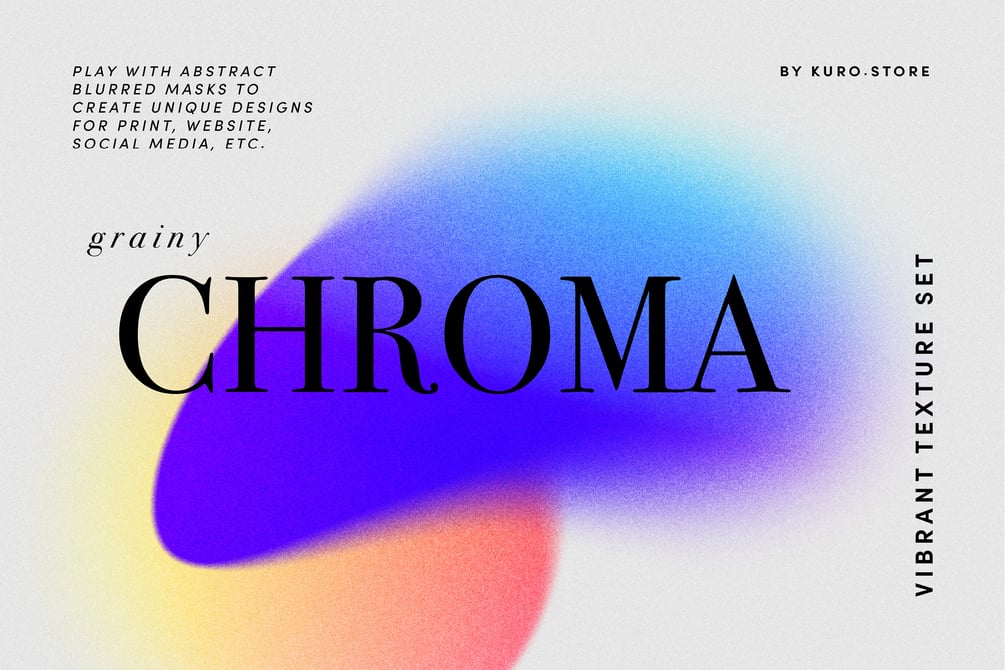 Chroma Grainy Gradient Textures – Vibrant gradients combined with abstract shapes and a retro style grainy texture overlay. For remarkable and modern designs for your project, like websites, brochures, posters or social media.