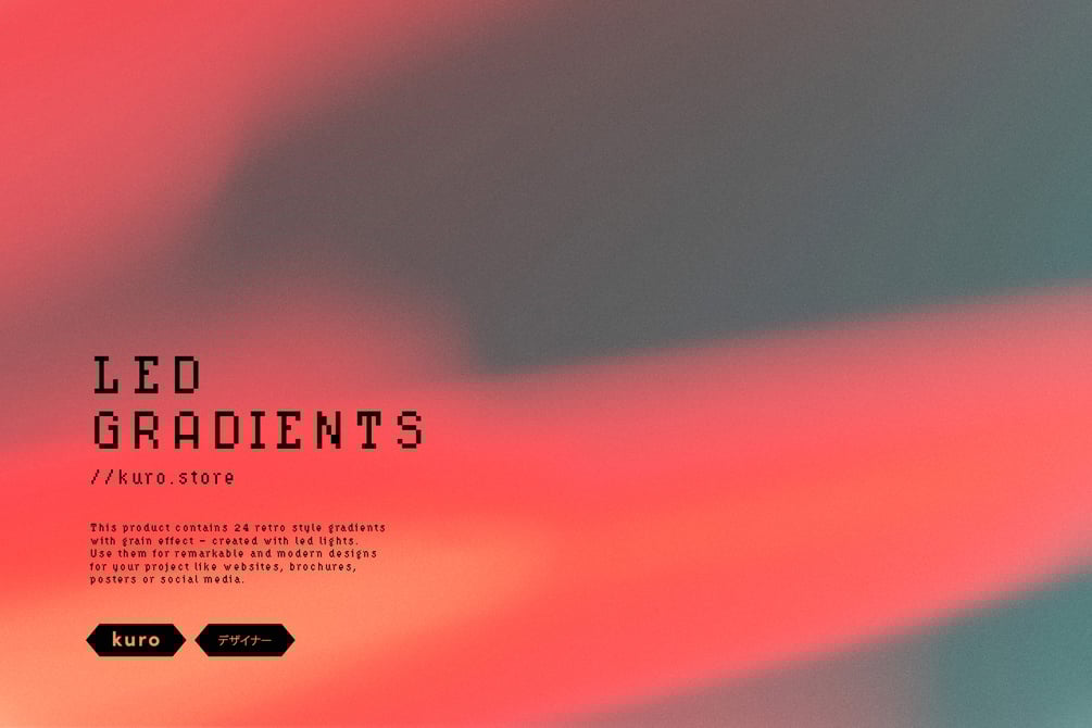 LED GRADIENTS – 24 retro style gradients with grain effect – created with led lights. Use them for remarkable and modern designs for your project like websites, brochures, posters or social media.